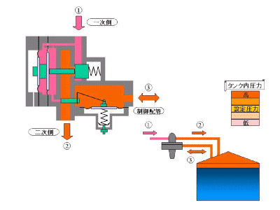 *2一次压力发生变化,与此相伴的设定压力也发生变化。通过导向方式使主阀动作,所以在全密封贮槽内当内压比设定压力高0.05~0.1kPa左右时比较稳定。